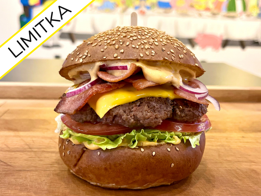 100% hovězí hamburger - 150g, sýr, slanina, ledový salát, červená cibule, rajče, chipotle majonéza, máslová bulka